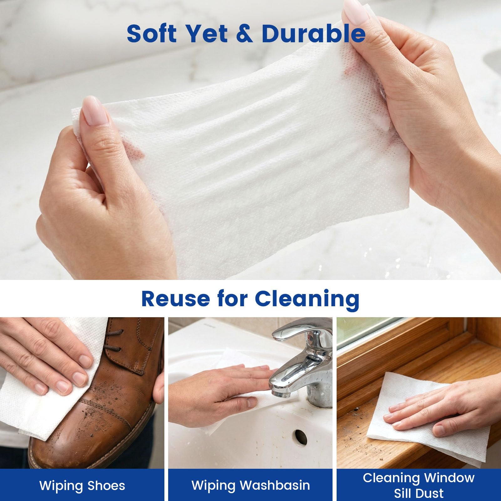 Made from premium non-woven fabric—soft enough for sensitive skin yet durable enough for heavy-duty cleaning. Chemical-free, odorless, and sterilized via UV light. No alcohol, fragrance, or fluorescent agents.