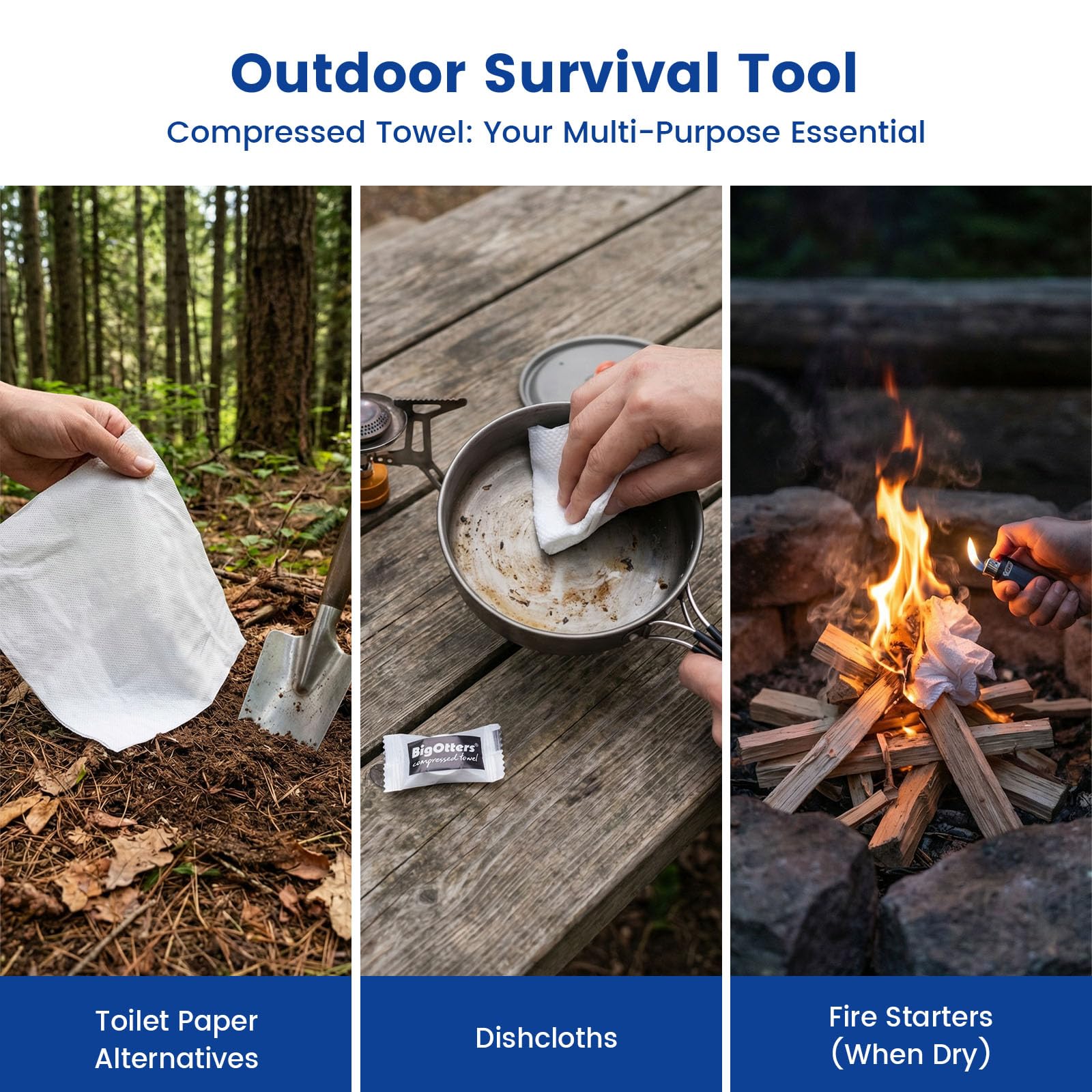 Compressed towel tablets that expand to full size with water. Each pack contains 100 individually wrapped tablets, compressed to coin size for maximum portability. Expand to 8.7" x 8.7" sturdy towels perfect for camping, travel, and emergencies.